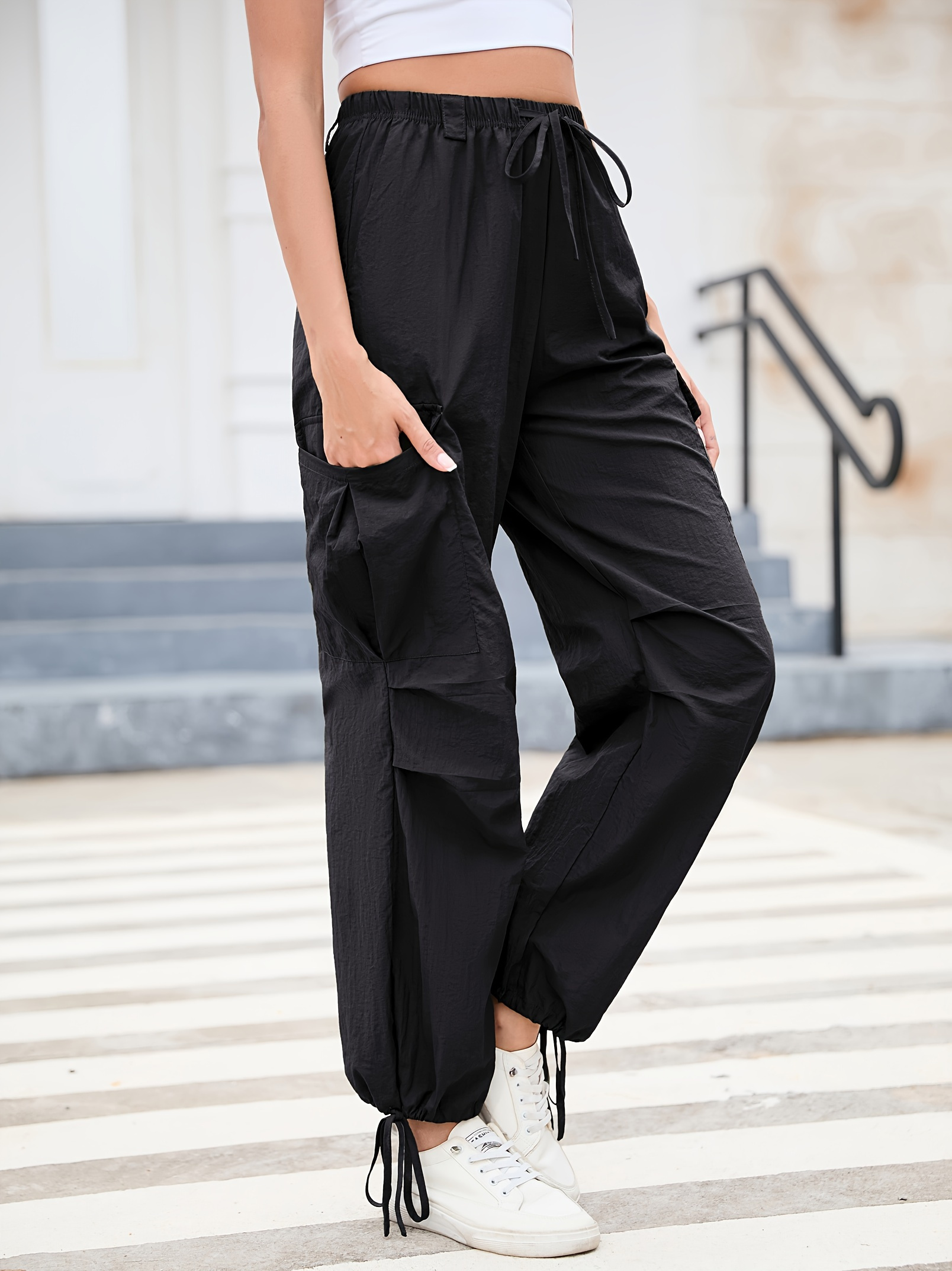1pc GoyRrbay Women'S Casual Nylon Cargo Jogger Pants - Solid Color Drawstring Low Waist Baggy Trousers, All-Season Loose Fit Long Pants for Going Out, Woven Sports Pants for Adults
