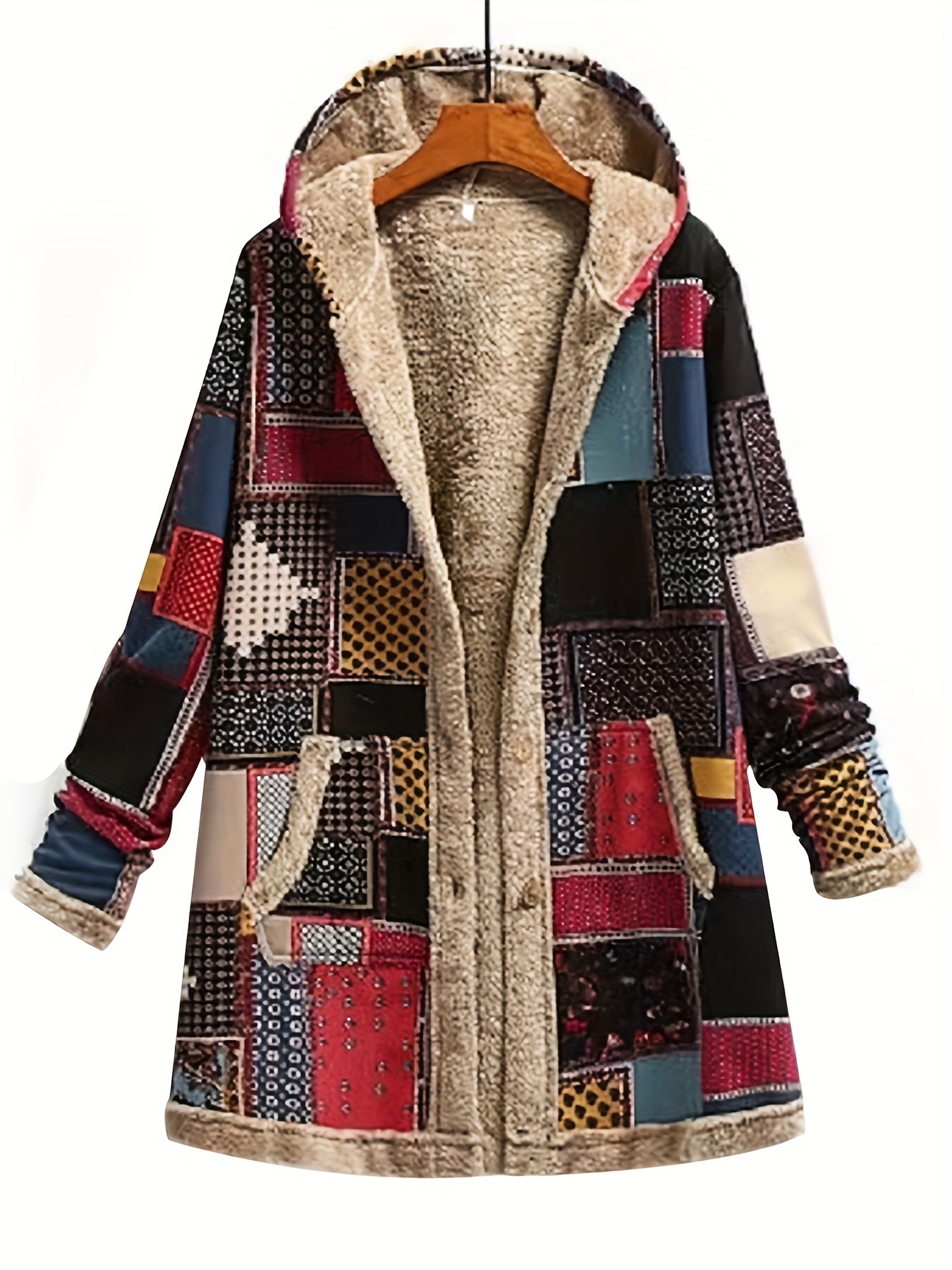 Autumn And Winter Women's Coat Warm Polyester National Style Print Hooded Casual Pocket Single-breasted Long-sleeved Women's Coat Daily Wear