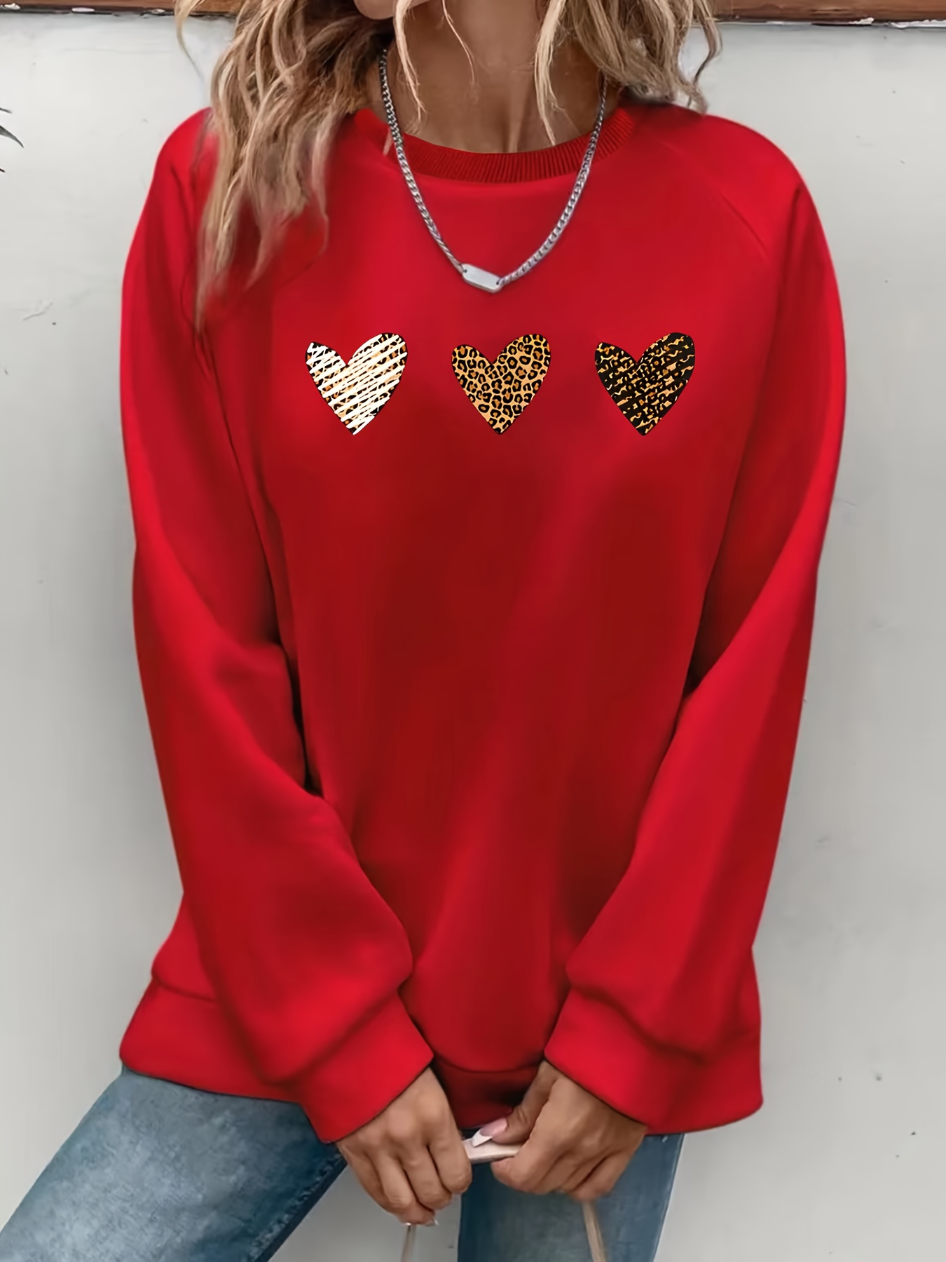 Plus Size Heart Print Sweatshirt, Casual Long Sleeve Crew Neck Pullover Sweatshirt, Women's Plus Size Clothing