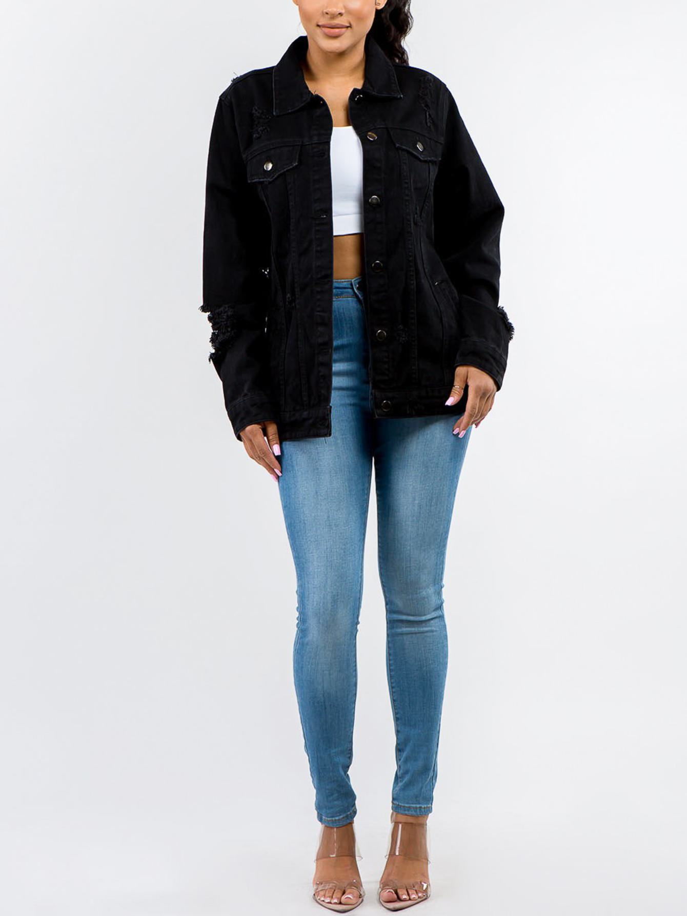 1pc Women'S Casual Cotton Faux Denim Jacket - Solid Color, Non-Stretch, Woven, Lapel Collar, Long Sleeve, Button-Front, Relaxed Fit, Hip Length - Versatile Outerwear for Spring/Fall/Winter