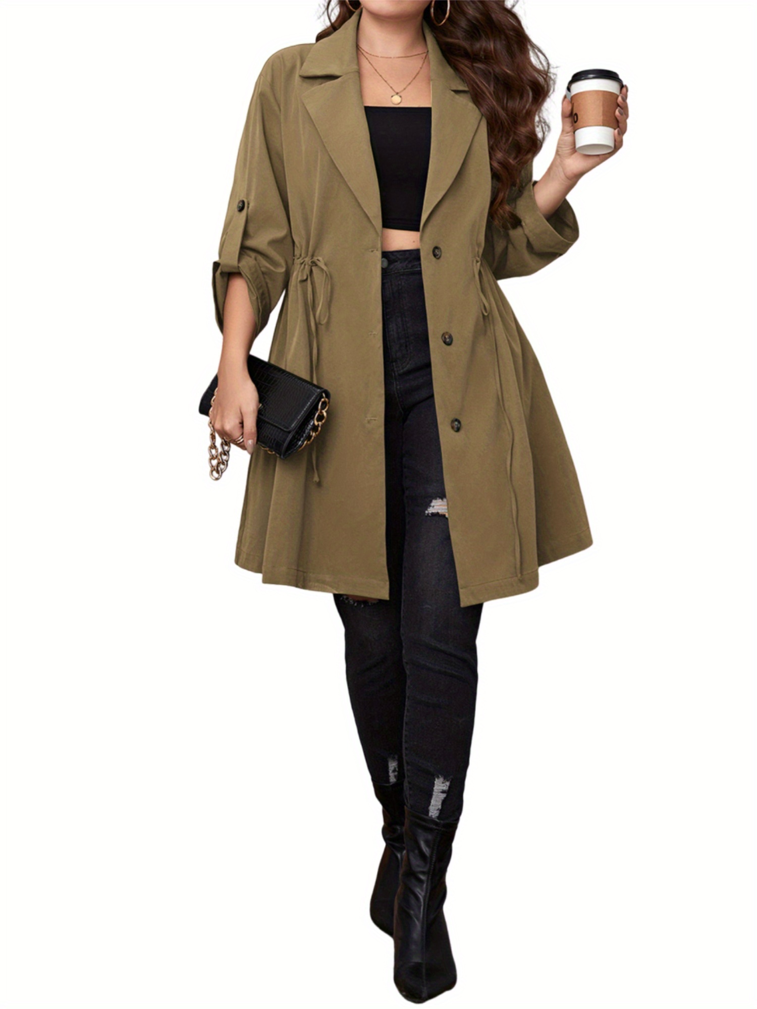 Elegant Plus Size Women's Jacket - Long Sleeve, Lapel Collar with Drawstring Waist, Button Closure - Machine Washable Fall Outerwear