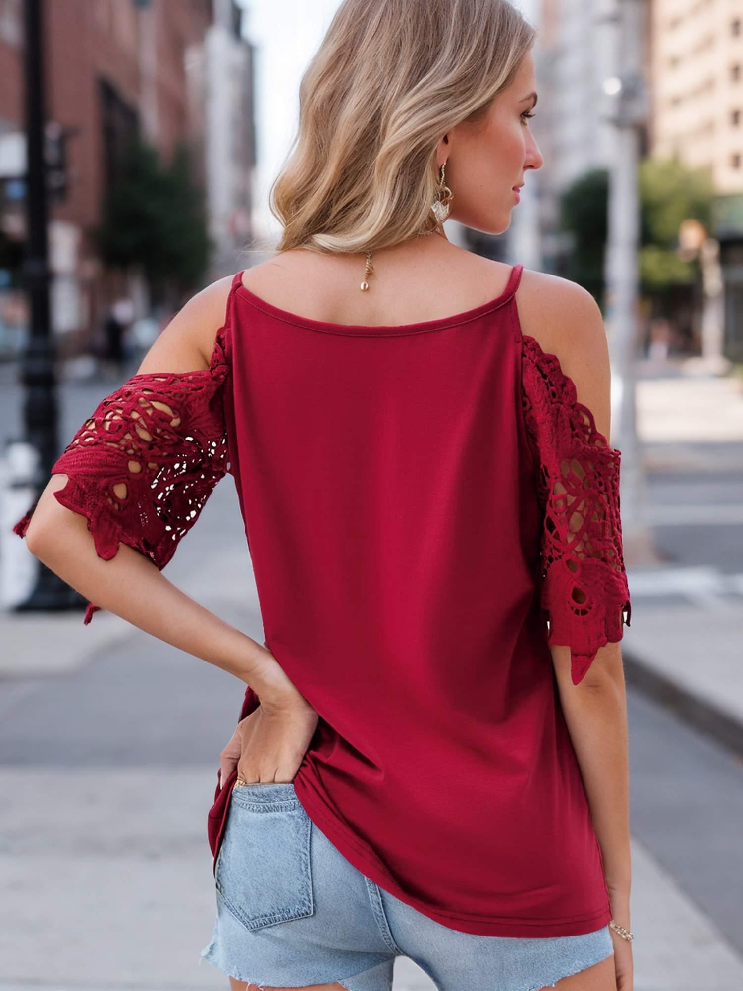 Plus Size Women'S V-Neck Lace Off-Shoulder Short-Sleeved T-Shirt