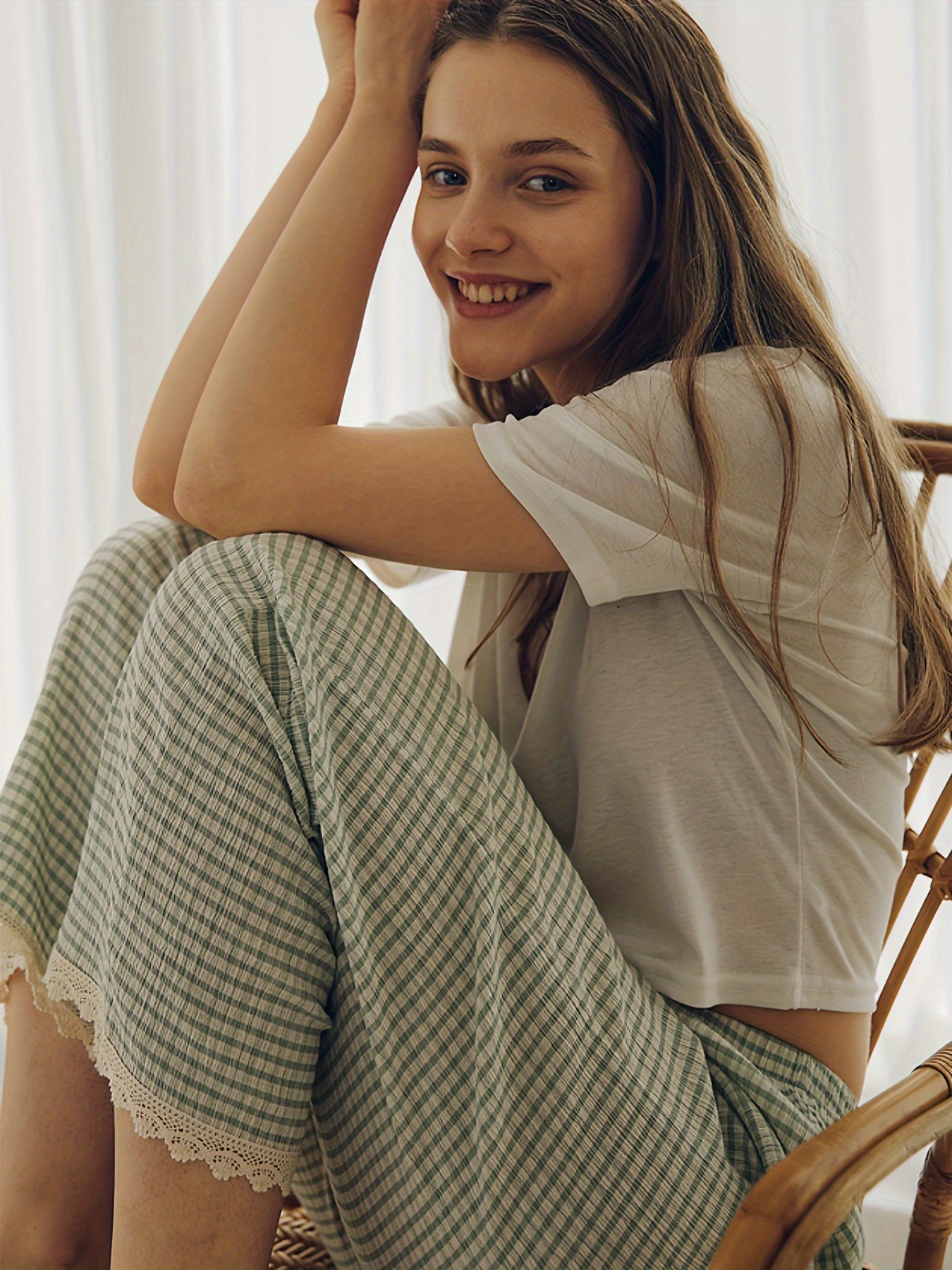 1pc Women'S All-Season Casual Polyester Lounge Pants with Lace Detail - Solid Color Woven Sports Pants for Home Comfort