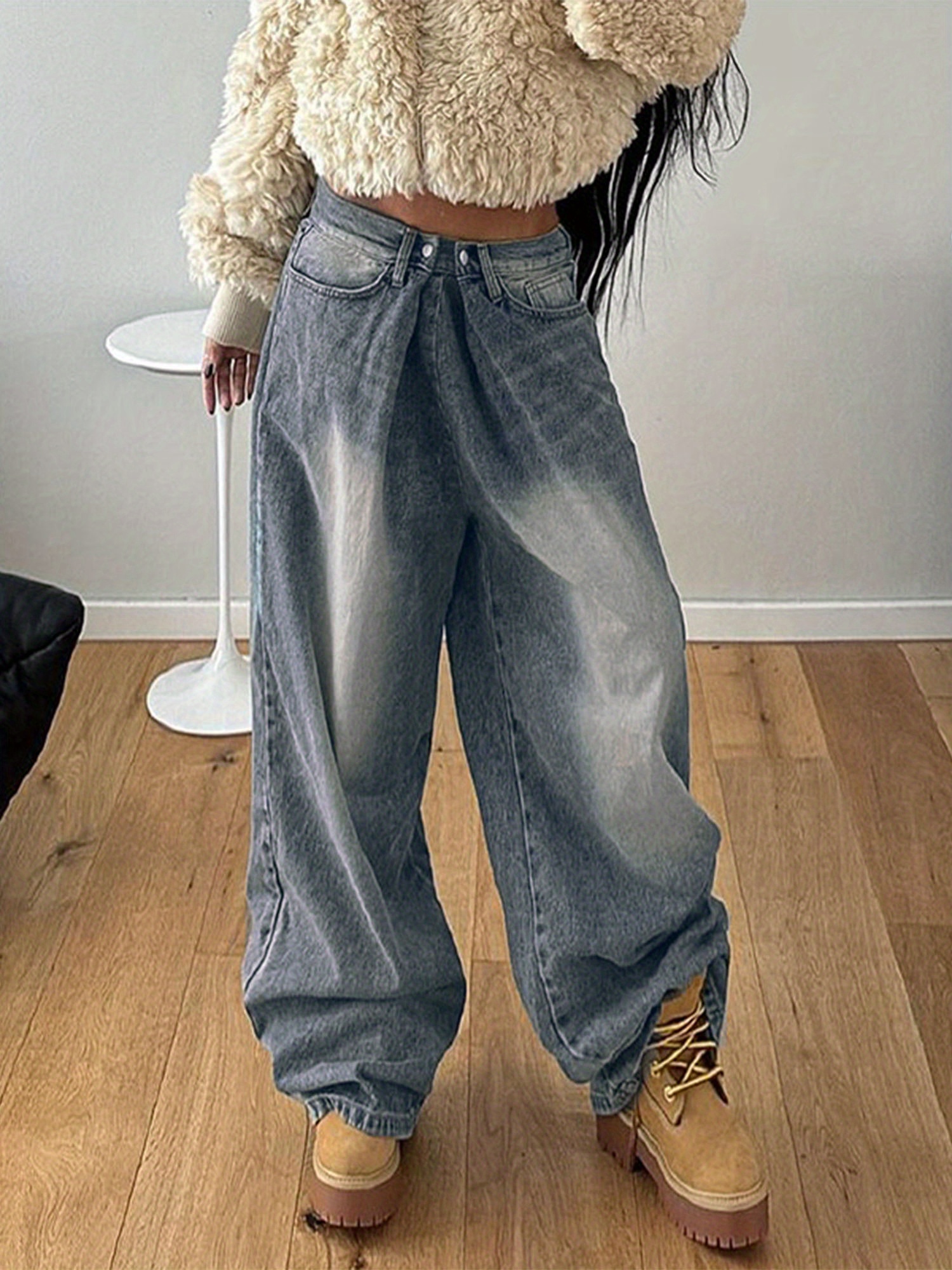 1pc Women'S High Waist Wide-Leg Faux Denim, Casual Style Solid Color Long Pants, Polyester Knit Fabric with Button Detail, All-Season Loose Fit Faux Denim Trousers