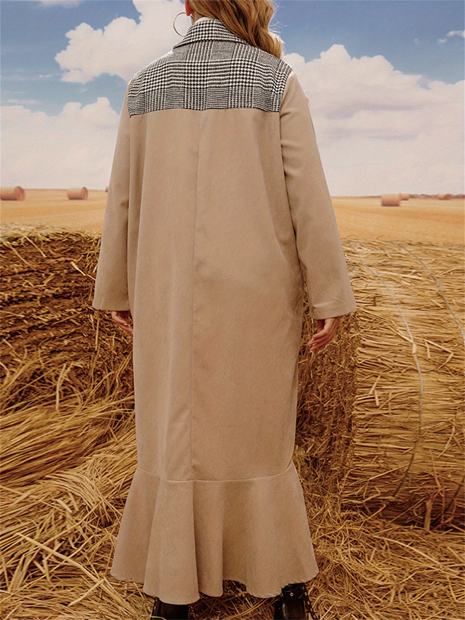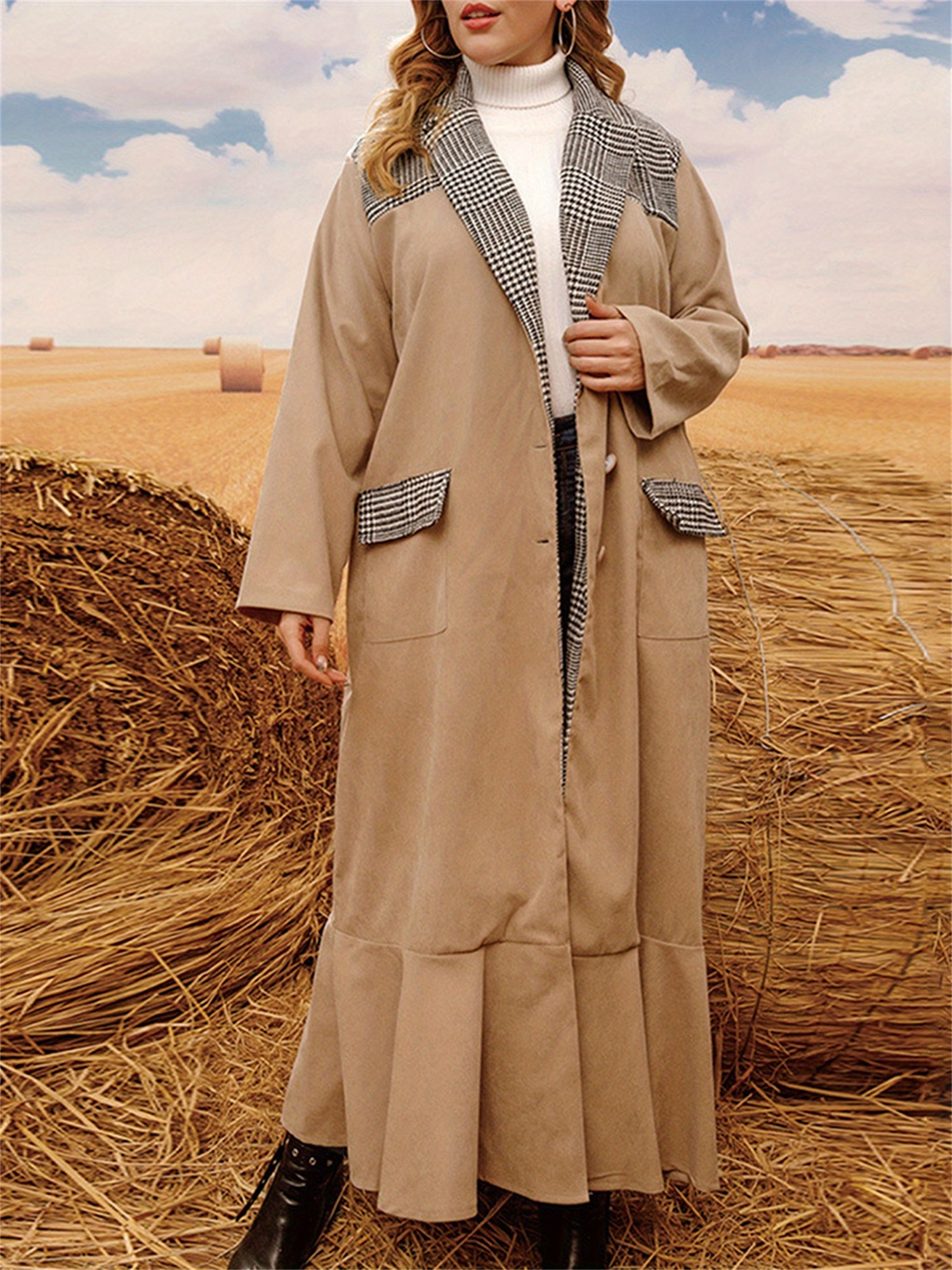 1pc Elegant Plus Size Women'S Casual Long Coat with Plaid Pockets and Ruffle Hem - Polyester Knit Fabric Cardigan Collar Windbreaker for Fall/Winter