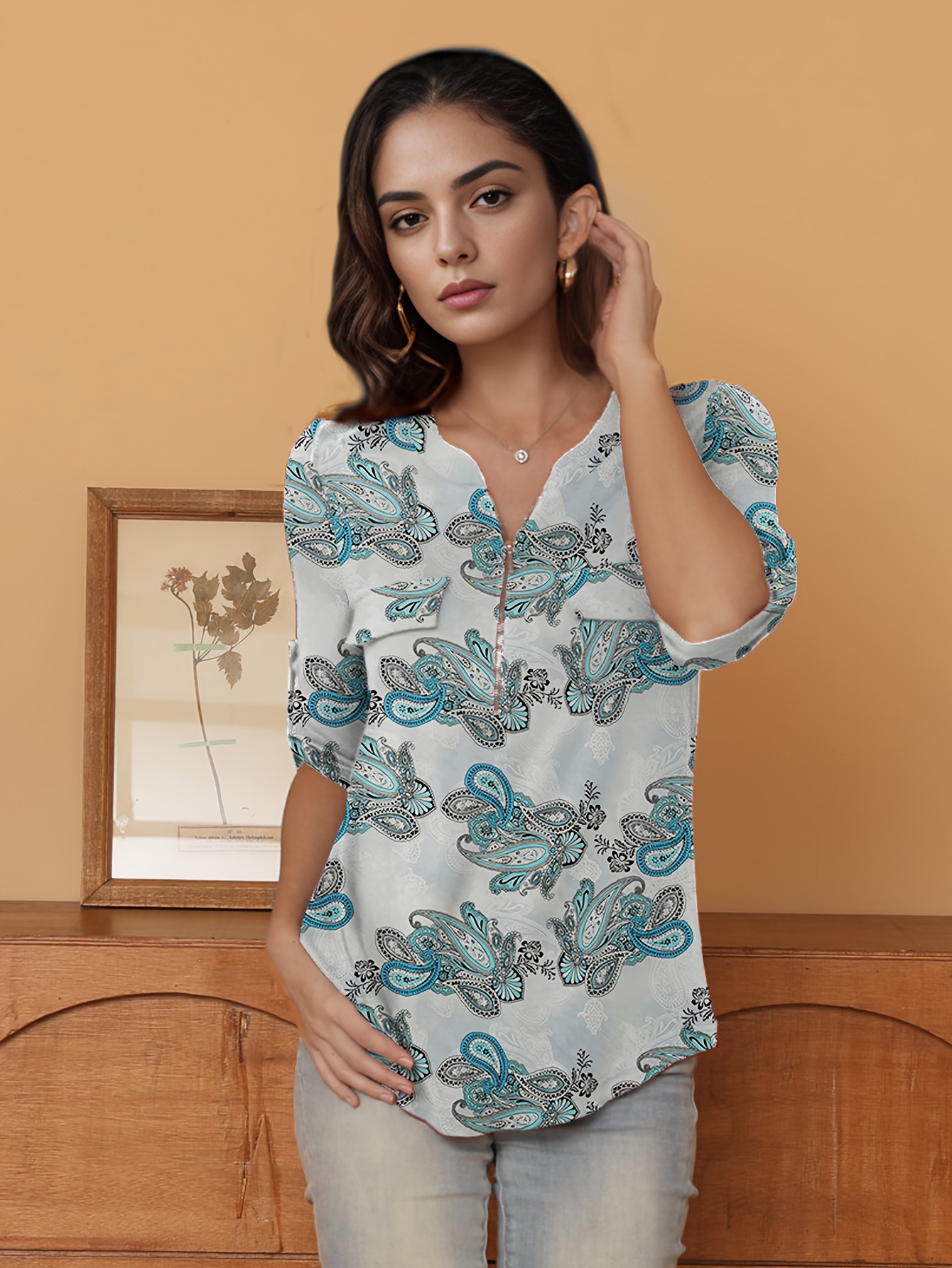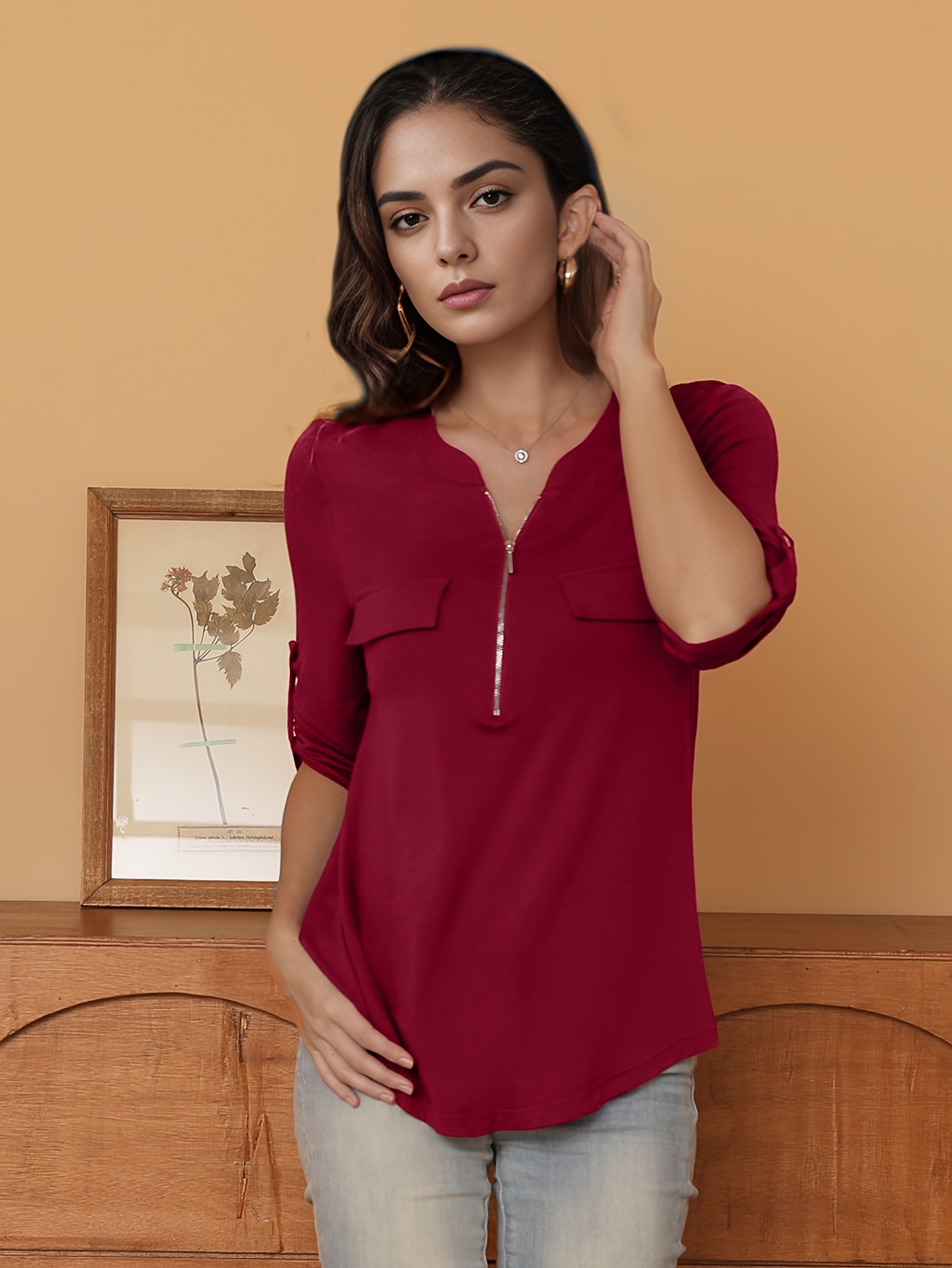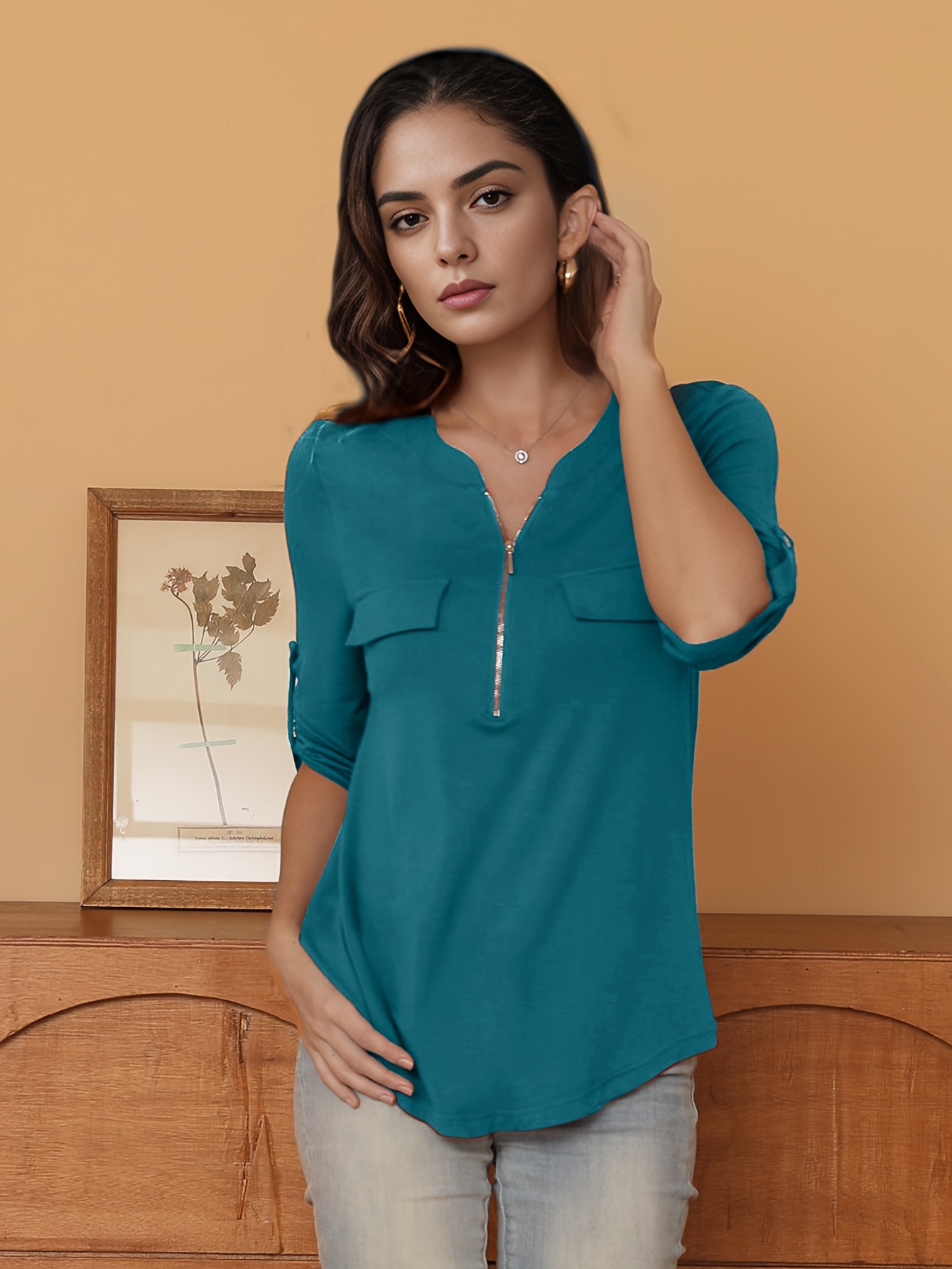 Stylish Women's V-Neck 3/4 Sleeve Zipper Shirt - Business Casual, Dressy Work Tunic Blouse with Relaxed Fit, Soft Fabric, and Versatile Style for Office, Meeting, or Daily Wear - Perfect for Career Women and Professionals