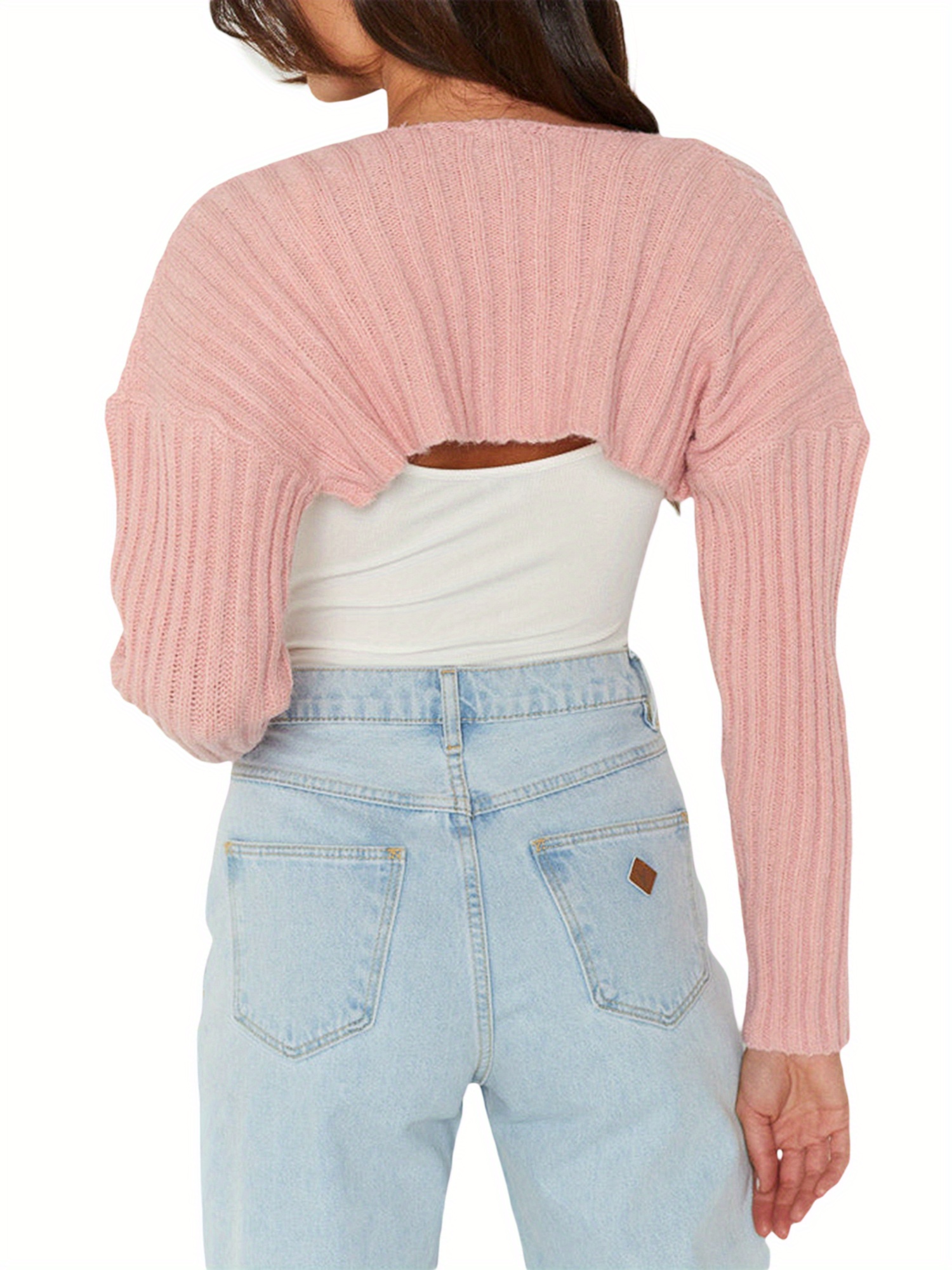 Plus Size Casual Knitted Cardigan, Crew Neck, Medium Stretch, Solid Color, Ultra-Short Sleeve Sweater Jacket for All Seasons