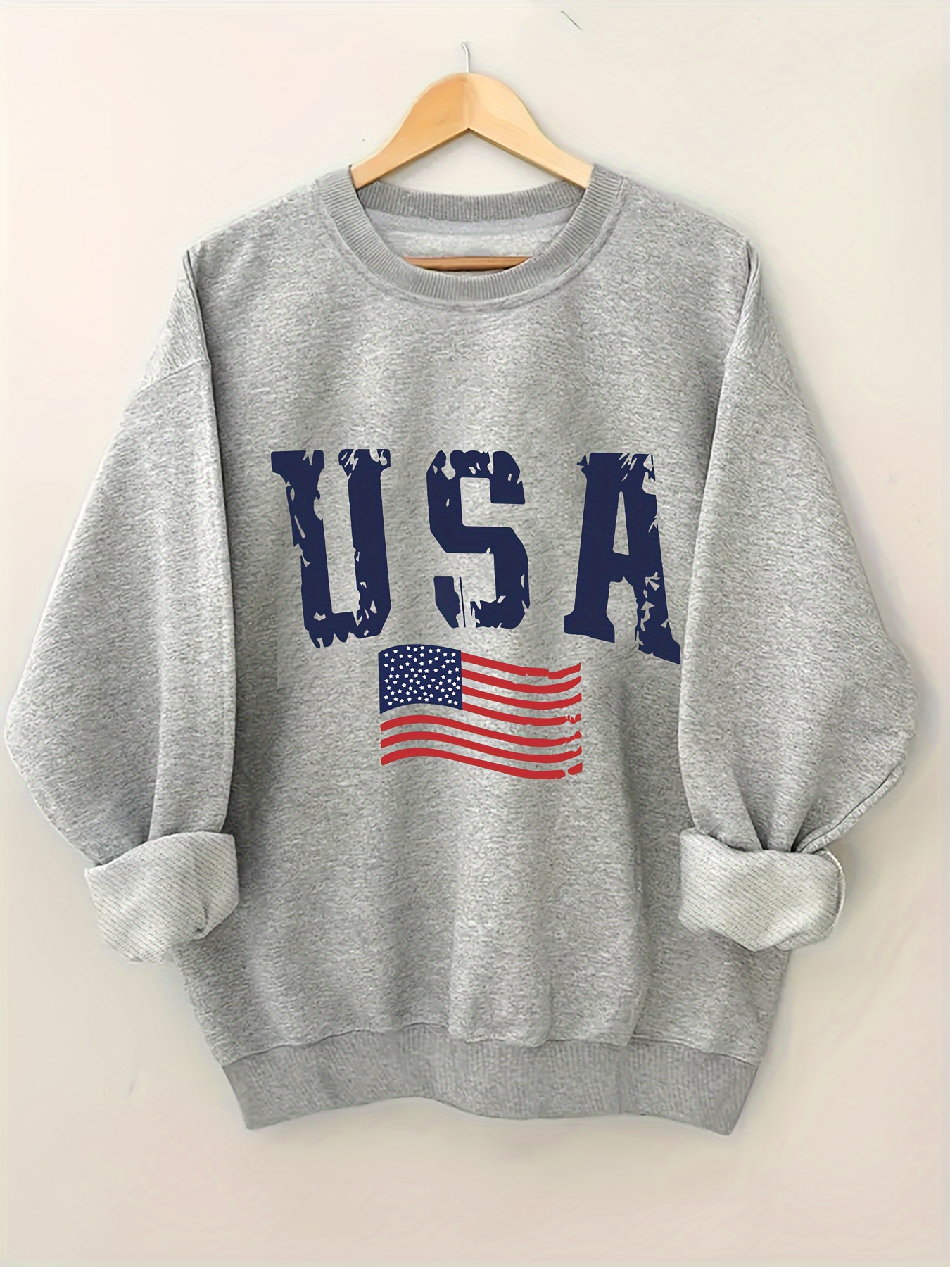 Plus Size USA Print Pullover Sweatshirt, Casual Long Sleeve Crew Neck Sweatshirt For Fall & Spring, Women's Plus Size Clothing