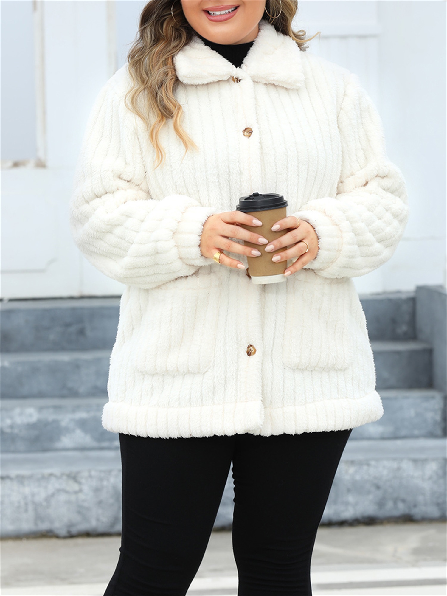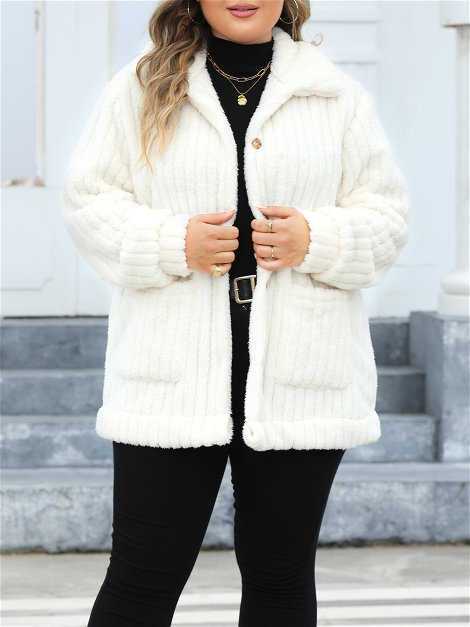 Plus Size Women'S Winter Jacket, Casual Lapel Collar, Cotton Blend, Slight Stretch, Solid Color, Reversible Plush Long Sleeve Cardigan Coat for Outwear Streetwear