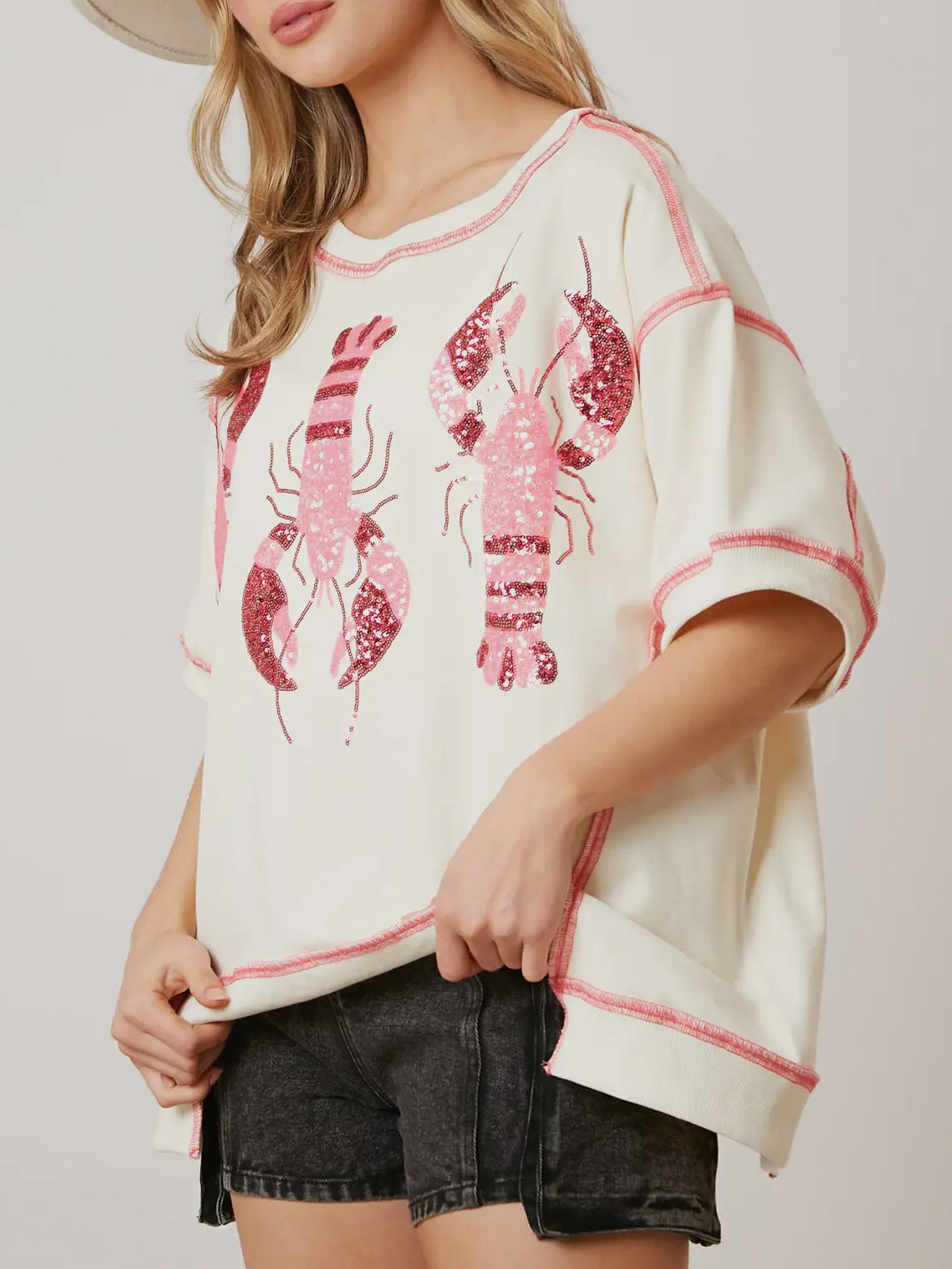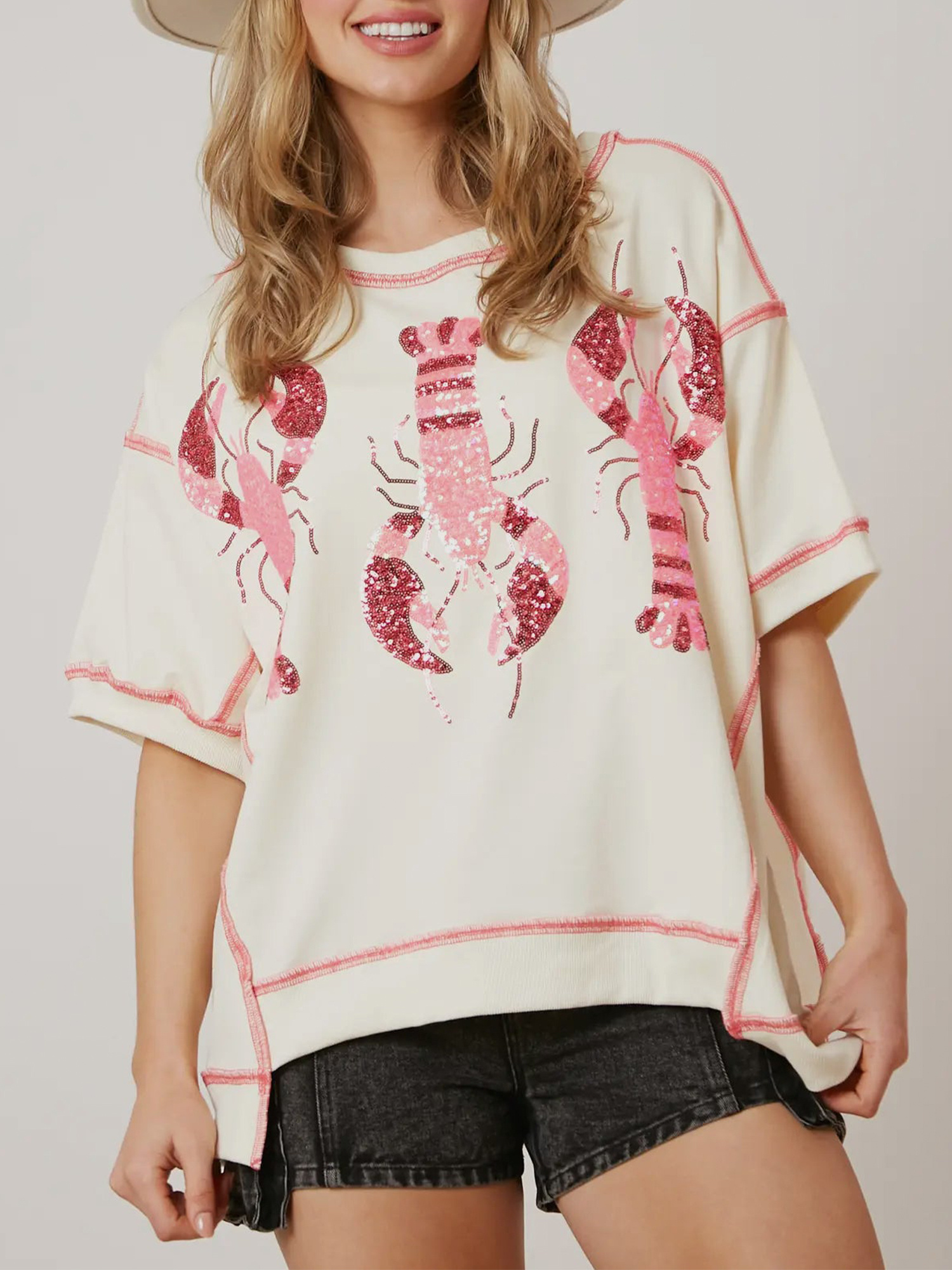 Women's Glitter Sequin Lobster & Crawfish Print T-Shirt - Casual Short Sleeve, Round Neck Top for Summer