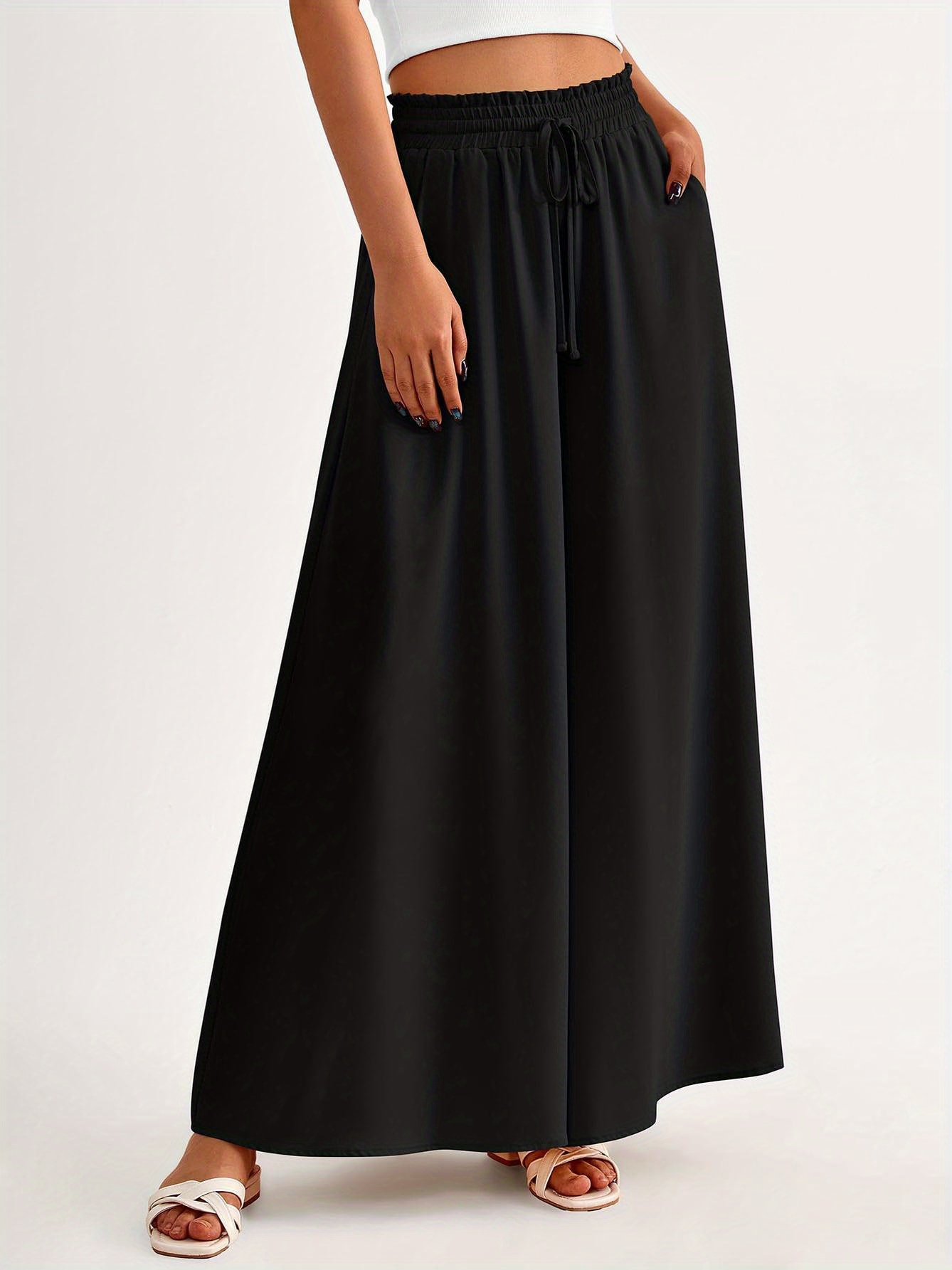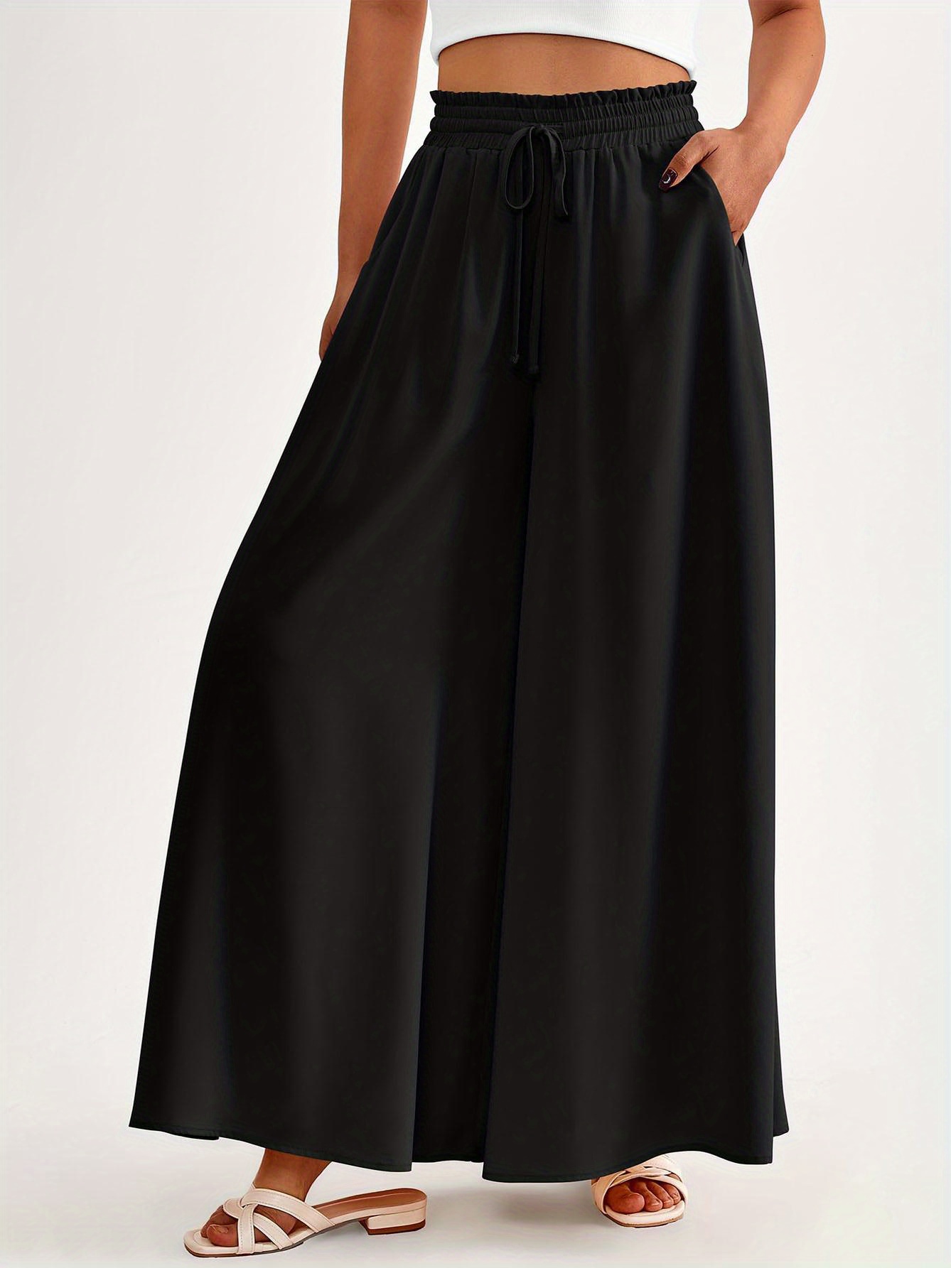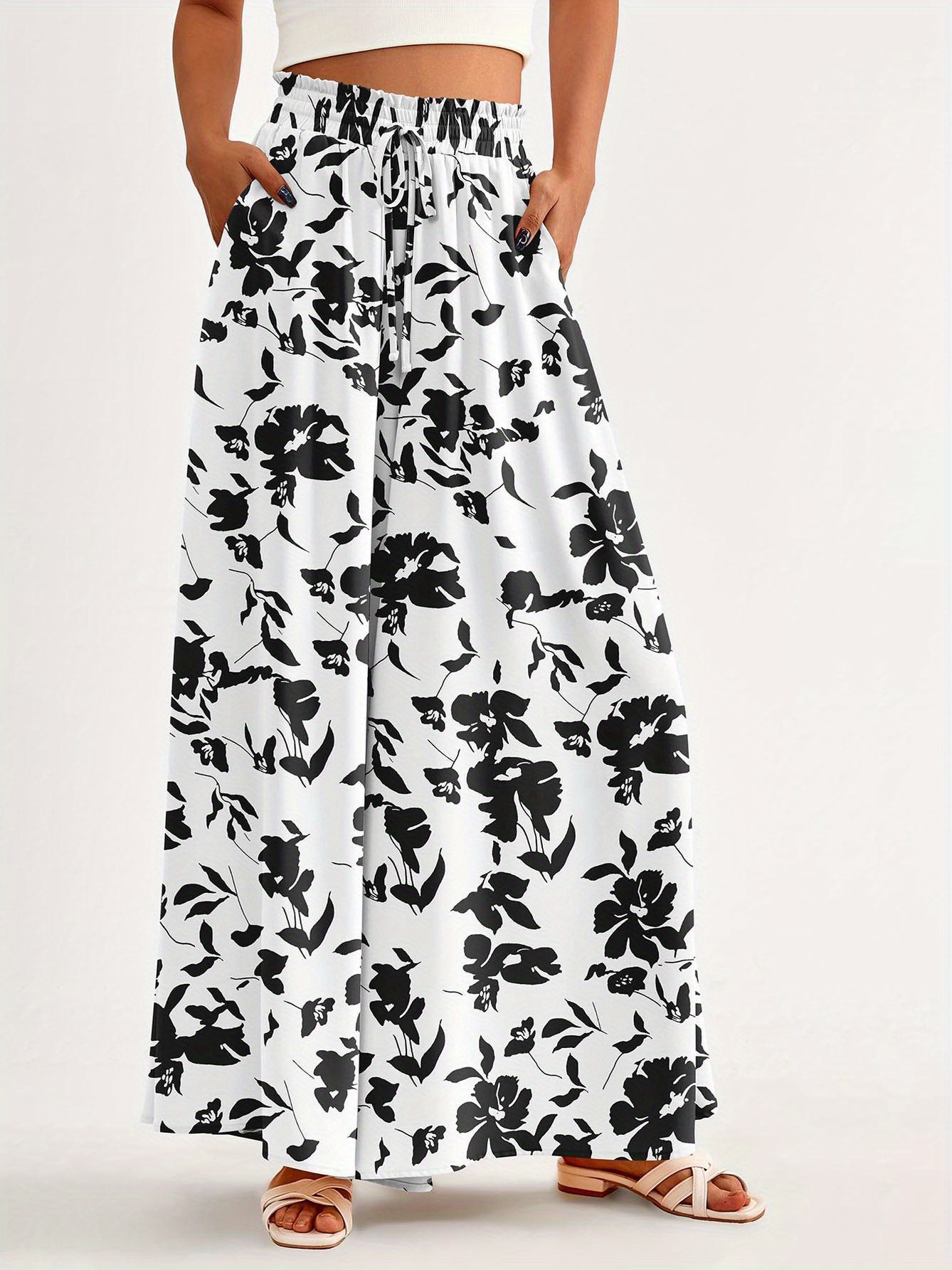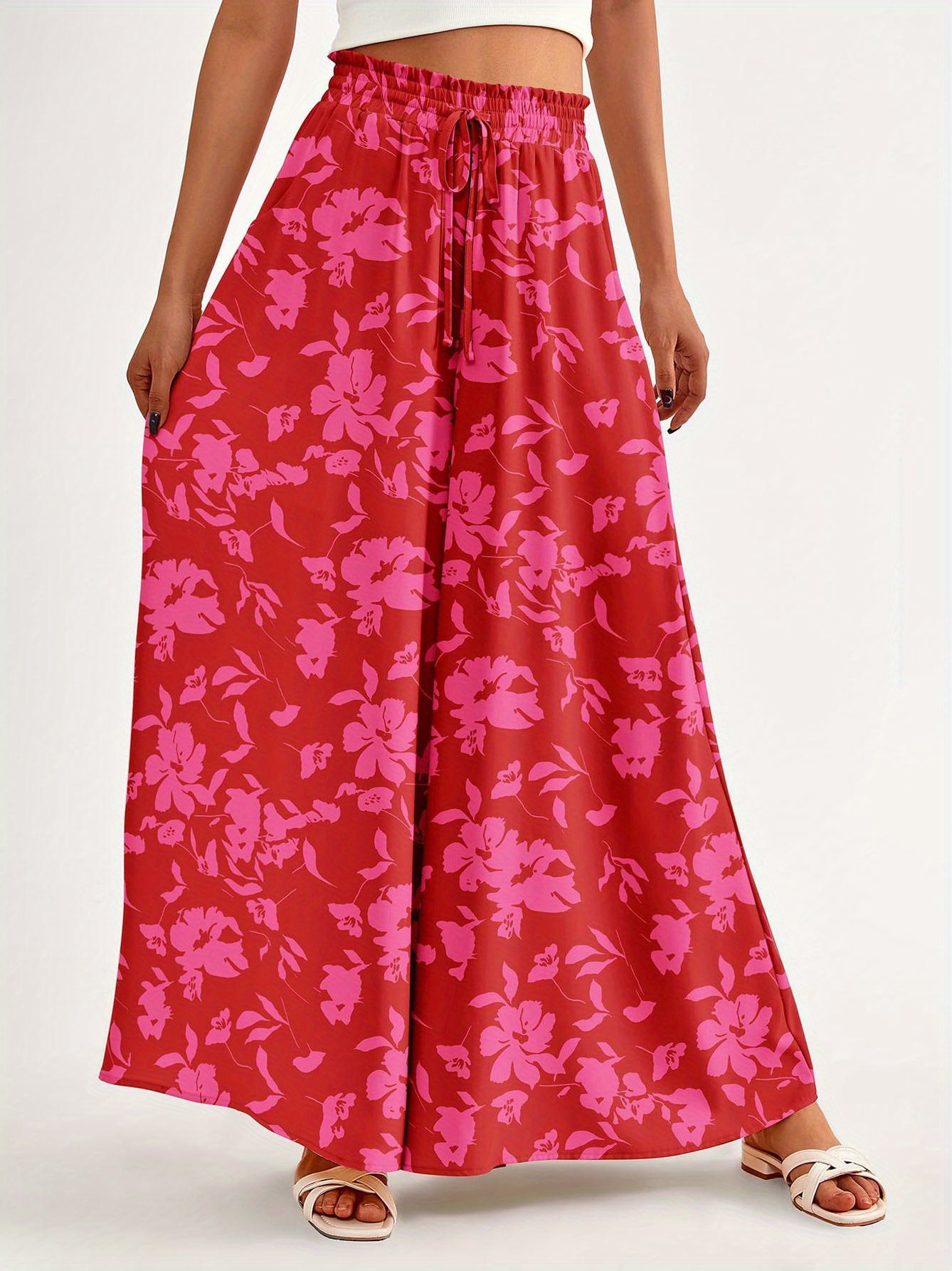 Floral Print Wide Leg Baggy Pants, Casual Drawstring Elastic Waist With Pockets Pants For Spring & Summer, Women's Clothing